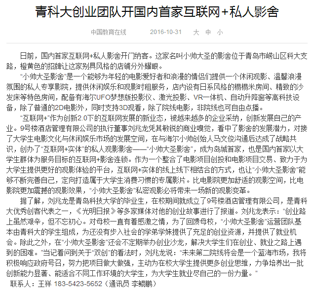 15届毕业生,在校期间,利用自己掌握的外教资源,成立青岛特瑞莎教育咨询公司,15年其创业事迹被央视焦点访谈栏目报道。