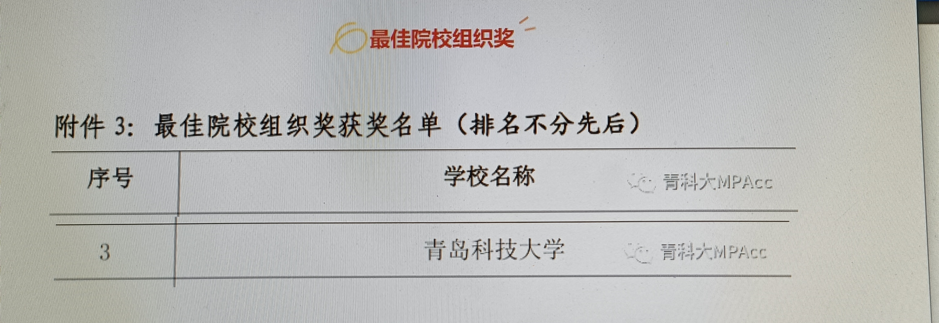 2023年5月12日至5月13日, 2023年全国高校商业精英挑战赛会计与商业管理案例竞赛山东省总决赛,MPAcc学子的作品在决赛作品中突出重围,斩获4个一等奖、4个二等奖、2个三等奖,青岛科技大学荣获最佳院校组织奖。